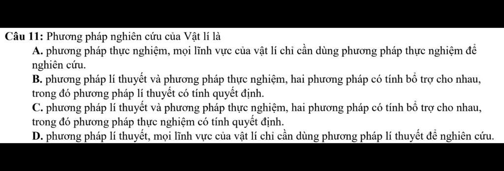 Câu 11: Phương pháp nghiên cứu của Vật lí là