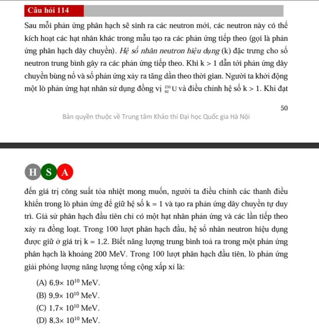 Năng lượng do phản ứng phân hạch lượt thứ 100 là: