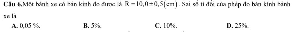Câu 6.Một bánh xe có bán kính đo được là R=10,0 ± 0,5(cm). Sai số tỉ đối của phép đo bán kính bánh xe là