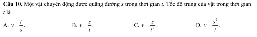 Câu 10. Một vật chuyển động được quãng đường s trong thời gian t. Tốc độ trung của vật trong thời gian t là