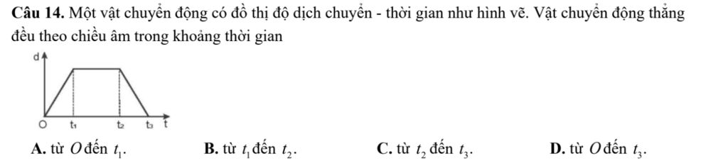 Từ `t_2` đến `t_3` vật chuyển động thẳng đều theo chiều âm vì đồ thị hướng từ trên xuống