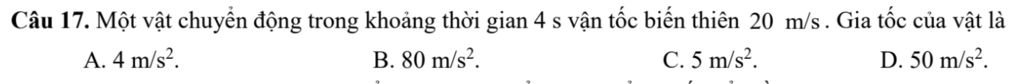 Câu 17. Một vật chuyển động trong khoảng thời gian 4 s vận tốc biến thiên 20 m/s. Gia tốc của vật là