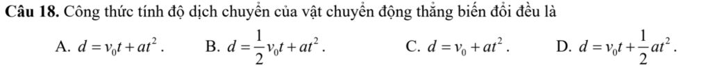 Câu 18. Công thức tính độ dịch chuyển của vật chuyển động thắng biến đổi đều là