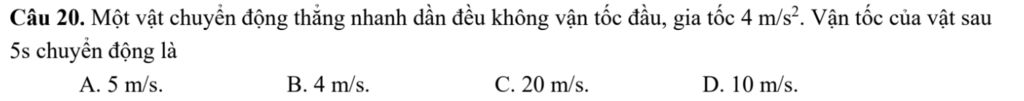 Câu 20. Một vật chuyển động thẳng nhanh dần đều không vận tốc đầu, gia tốc 4 m/s². Vận tốc của vật sau 5s chuyển động là
