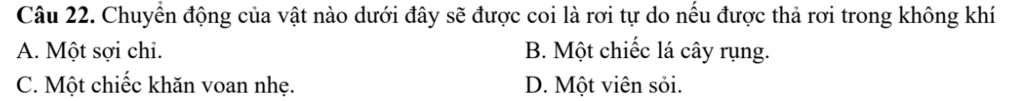 Câu 22. Chuyển động của vật nào dưới đây sẽ được coi là rơi tự do nếu được thả rơi trong không khí A. Một sợi chỉ.