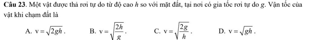 Câu 23. Một vật được thả rơi tự do từ độ cao h so với mặt đất, tại nơi có gia tốc rơi tự do g. Vận tốc của vật khi chạm đất là
