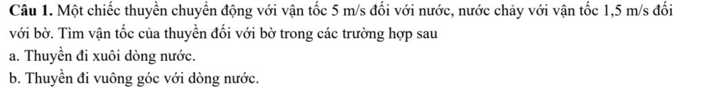 Câu 1. Một chiếc thuyền chuyển động với vận tốc 5 m/s đối với nước, nước chảy với vận tốc 1,5 m/s đối với bờ. Tìm vận tốc của thuyền đối với bờ trong các trường hợp sau
