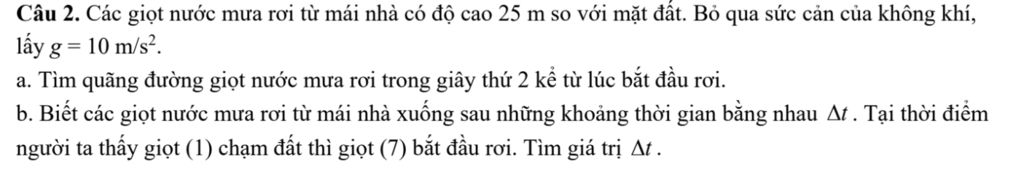 Câu 2. Các giọt nước mưa rơi từ mái nhà có độ cao 25 m so với mặt đất. Bỏ qua sức cản của không khí, lay g=10 m/s². a. Tìm quãng đường giọt nước mưa rơi trong giây thứ 2 kể từ lúc bắt đầu rơi. b. Biết các giọt nước mưa rơi từ mái nhà xuống sau những khoảng thời gian bằng nhau Δt . Tại thời điểm người ta thấy giọt (1) chạm đất thì giọt (7) bắt đầu rơi. Tìm giá trị Δ .