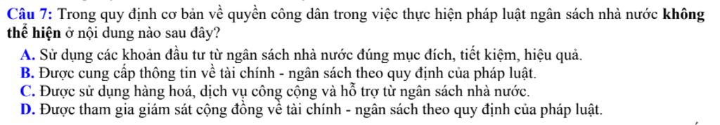 `7)` Trong quy định cơ bản về quyền công dân trong việc thực hiện pháp luật ngân sách nhà nước không thể hiện ở nội dung nào sau đây?
