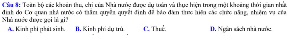 `8)` Toàn bộ các khoản thu, chi của Nhà nước được dự toán và thực hiện trong một khoảng thời gian nhất định do Cơ quan nhà nước có thẩm quyền quyết định để bảo đảm thực hiện các chức năng, nhiệm vụ của Nhà nước được gọi là gì?