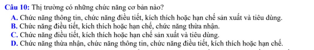 Thị trường có những chức năng cơ bản `:` Điều tiết `,` kích thích hoặc hạn chế `,` thừa nhận