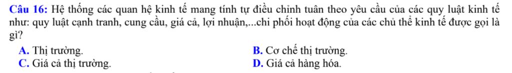`16)` Hệ thống các quan hệ kinh tế mang tính tự điều chỉnh tuân theo yêu cầu của các quy luật kinh tế như: quy luật cạnh tranh, cung cầu, giá cả, lợi nhuận,...chi phối hoạt động của các chủ thể kinh tế được gọi là