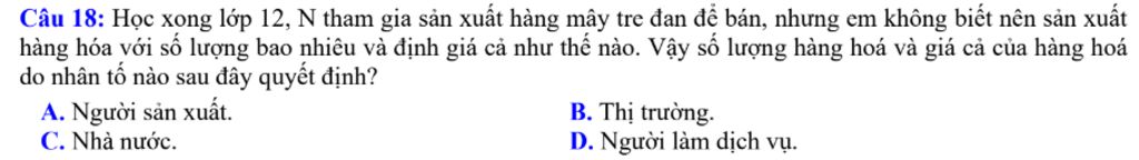 `18)` Học xong lớp 12, N tham gia sản xuất hàng mây tre đan để bán, nhưng em không biết nên sản xuất hàng hóa với số lượng bao nhiêu và định giá cả như thế nào. Vậy số lượng hàng hoá và giá cả của hàng hoá do nhân tố nào sau đây quyết định?