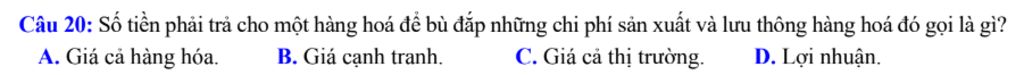 `20)` Số tiền phải trả cho một hàng hoá để bù đắp những chi phí sản xuất và lưu thông hàng hoá đó gọi là gì?