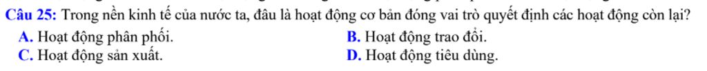 `25)` Trong nền kinh tế của nước ta, đâu là hoạt động cơ bản đóng vai trò quyết định các hoạt động còn lại?