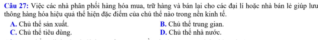 Câu `27`: Việc các nhà phân phối hàng hóa mua, trữ hàng và bán lại cho các đại lí hoặc nhà bán lẻ giúp lưu thông hàng hiệu quả thể hiện đặc điểm của chủ thể nào trong nền kinh tế