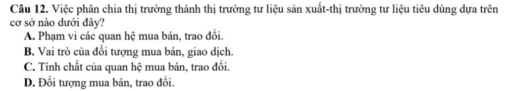 `12)` Việc phân chia thị trường thành thị trường tư liệu sản xuất-thị trường tư liệu tiêu dùng dựa trên cơ sở nào dưới đây?