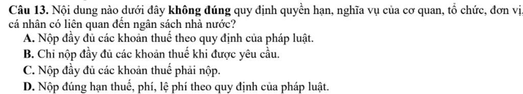 Câu `13`: Nội dung nào dưới đây không đúng quy định quyền hạn, nghĩa vụ của cơ quan, tổ chức, đơn vị, cá nhân có liên quan đến ngân sách nhà nước?