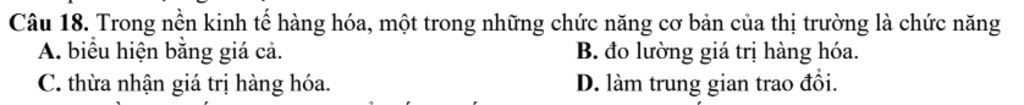 `18)` Trong nền kinh tế hàng hóa, một trong những chức năng cơ bản của thị trường là chức năng