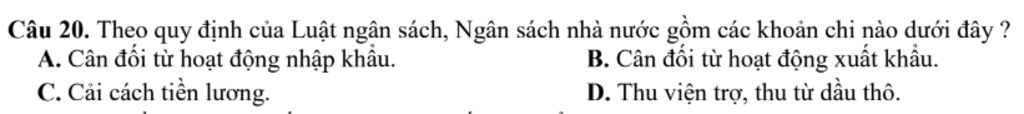 Câu 20. Theo quy định của Luật ngân sách, Ngân sách nhà nước gồm các khoản chi nào dưới đây ?