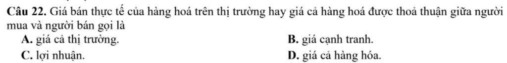 Câu `22`: Gía bán thực tế của hàng hóa trên thị trường hay giá cả hàng hóa được thỏa thuận giữa người mua và người bán gọi là