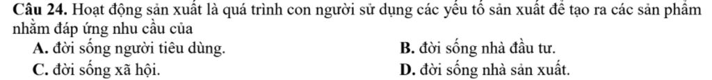 `24)` Hoạt động sản xuất là quá trình con người sử dụng các yếu tố sản xuất để tạo ra các sản phẩm nhằm đáp ứng nhu cầu của