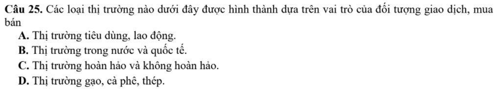 `25)` . Các loại thị trường nào dưới đây được hình thành dựa trên vai trò của đối tượng giao dịch, mua bán