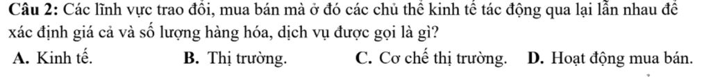 Câu `2`: Các lĩnh vực trao đổi, mua bán mà ở đó các chủ thể kinh tế tác động qua lại lẫn nhau để xác định giá cả và số lượng hàng hóa, dịch vụ được gọi là?