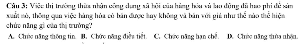 `+` Việc thị trường thừa nhận công dụng xã hội của hàng hóa và lao động đã hao phí để sản xuất nó, thông qua việc hàng hóa có bán được hay không và bán với giá như thế nào thể hiện chức năng thừa nhận của thị trường.