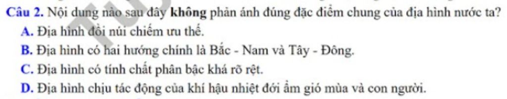 `-` Giải thích: Đặc điểm chung của địa hình nước ta chủ yếu có hai hướng chính là Tây Bắc - Đông Nam và Đông Bắc - Tây Nam, không phải là Bắc - Nam và Tây - Đông. Các đặc điểm khác như địa hình đồi núi chiếm ưu thế, tính chất phân bậc rõ rệt và sự tác động của khí hậu nhiệt đới ẩm gió mùa và con người đều đúng.