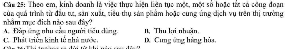 Câu 25: Theo em, kinh doanh là việc thực hiện liên tục một, một số hoặc tất cả công đoạn của quá trình từ đầu tư, sản xuất, tiêu thụ sản phẩm hoặc cung ứng dịch vụ trên thị trường nhằm mục đích nào sau đây?