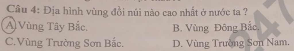 `-` Giải thích: Vùng Tây Bắc có địa hình đồi núi cao nhất ở nước ta, với nhiều đỉnh núi cao như Phan Xi Păng (`3.143` m) thuộc dãy Hoàng Liên Sơn, đây là khu vực có địa hình hiểm trở và cao nhất trong các vùng đồi núi Việt Nam.
