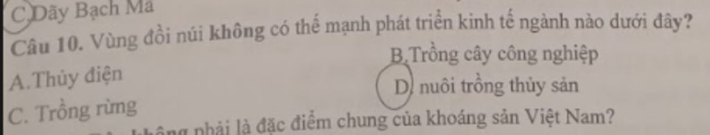 Câu `10.` Vùng đồi núi không có thể mạnh phát triển kinh tế ngành nào dưới đây`?`