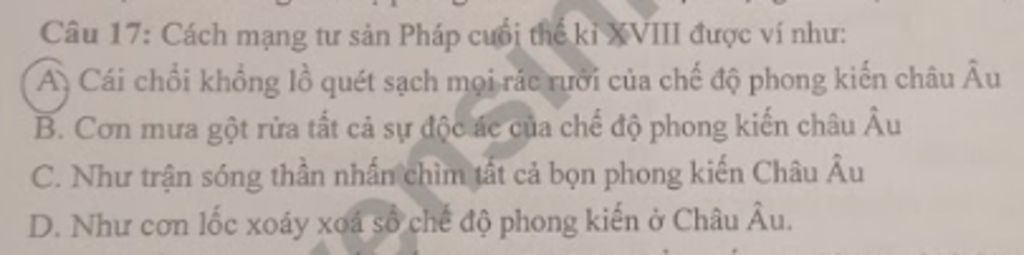 `-` Giải thích: Cách mạng tư sản Pháp cuối thế kỷ XVIII được ví như "cái chổi khổng lồ" vì nó đã làm sạch các cấu trúc phong kiến và thiết lập nền dân chủ tư sản, có ảnh hưởng sâu rộng đến các phong trào cách mạng khác ở châu Âu.