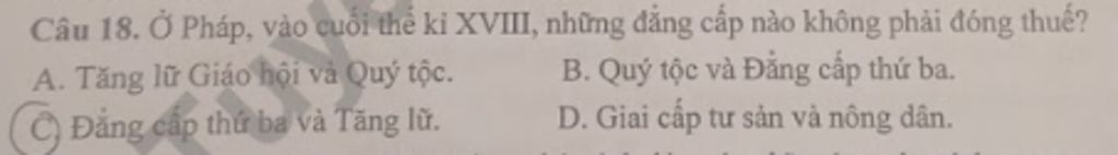 `-` Giải thích: Vào cuối thế kỉ XVIII, ở Pháp, hai đẳng cấp lớn là Tăng lữ (Giáo hội) và Quý tộc không phải đóng thuế, trong khi đó Đẳng cấp thứ ba (gồm nông dân và giai cấp tư sản) phải gánh vác phần lớn thuế má. Điều này góp phần gây ra sự bất bình trong xã hội và là một trong những nguyên nhân dẫn đến Cách mạng Pháp năm 1789.