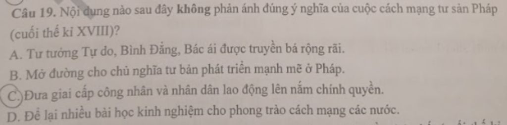 - Đưa giai cấp công nhân và nhân dân lao động lên nắm chính quyền là nội dung không phản ánh đúng ý nghĩa của cuộc cách mạng tư sản Pháp bởi giá trị của cách mạng tư sản Phan là truyền bá tư tưởng tự do , bình đẳng và mở đường cho chủ nghĩa tư bản phát triển .