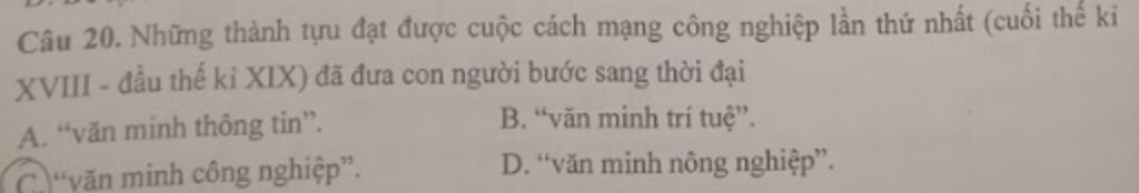 GT:Những thành tựu đạt được trong cuộc cách mạng công nghiệp lần thứ nhất (cuối thế kỷ XVIII - đầu thế kỷ XIX) đã đưa con người bước sang thời đại . “văn minh công nghiệp”.