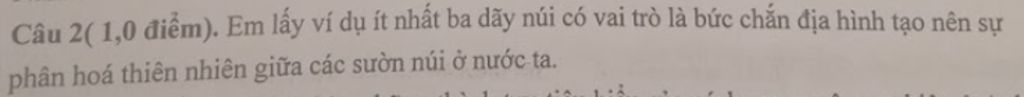 Ba dãy núi có vai trò là bức chắn địa hình tạo nên sự phân hóa thiên nhiên giữa các sườn núi ở nước ta là `:` Dãy Hoành Sơn , Dãy Bạch Mã , Dãy Trường Sơn Bắc
