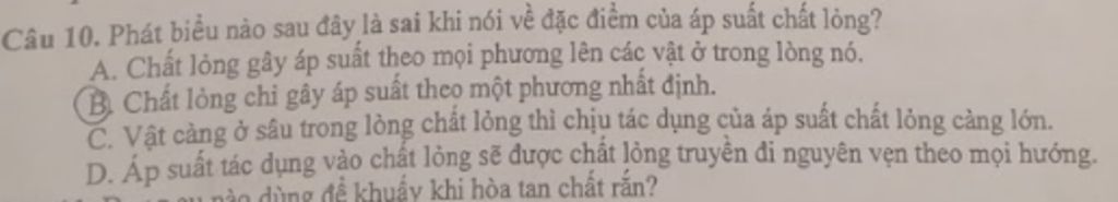 Câu `10:` Phát biểu nào sau đây là sai khi nói về đặc điểm của áp suất chất lỏng `?`