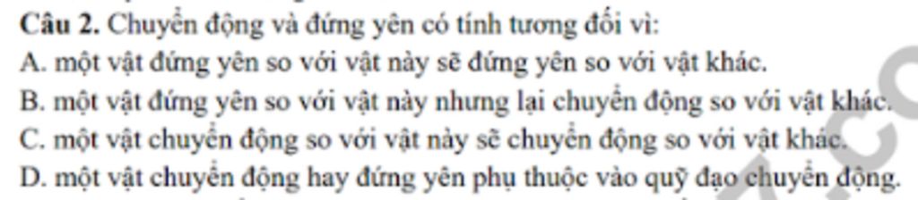 `=>` `B.` một vật đứng yên so với vật này nhưng lại chuyển động so với vật khác.