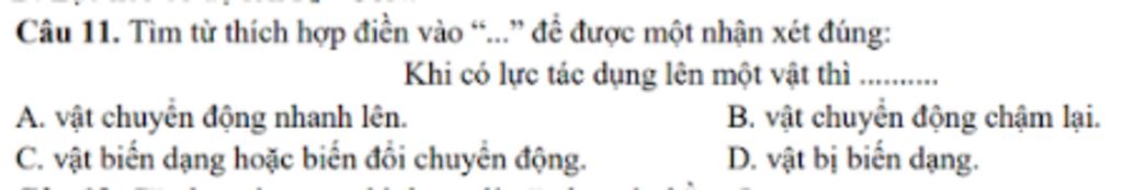 Câu `11.` Tìm từ thích hợp điền vào `“.”` để được một nhận xét đúng`:` Khi có lực tác dụng lên một vật thì `.....`