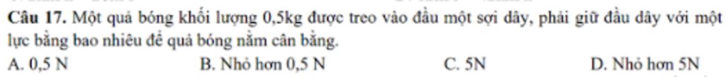 Câu `17:` Một quả bóng khối lượng `0,5kg` được treo vào đầu một sợi dây, phải giữ đầu dây với một lực bằng bao nhiêu để quả bóng nằm cân bằng.