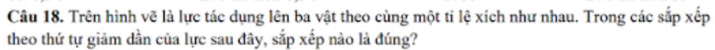 Câu `18.` Trên hình vẽ là lực tác dụng lên ba vật theo cùng một tỉ lệ xích như nhau. Trong các sắp xếp theo thứ tự giảm dần của lực sau đây, sắp xếp nào là đúng`?`