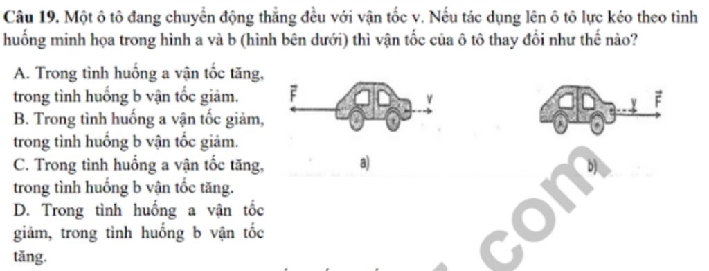 Câu `19.` Một ô tô đang chuyển động thẳng đều với vận tốc `v`. Nếu tác dụng lên ô tô lực kéo theo tình huống minh họa trong hình `a `và `b` `(` hình bên dưới `)` thì vận tốc của ô tô thay đổi như thế nào `?`