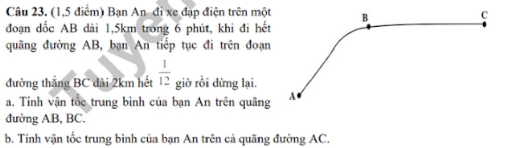 Câu 23. (1,5 điểm) Bạn An đi xe đạp điện trên một đoạn dốc AB dài 1,5km trong 6 phút, khi đi hết quãng đường AB, bạn An tiếp tục đi trên đoạn đường thẳng BC dài 2km hết 12 giờ rồi dừng lại.