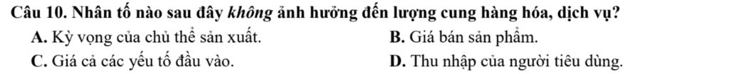 Câu 10. Nhân tố nào sau đây không ảnh hưởng đến lượng cung hàng hóa, dịch vụ?