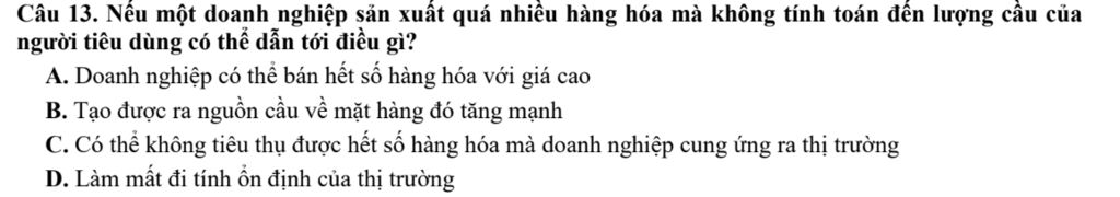 Câu 13. Nếu một doanh nghiệp sản xuất quá nhiều hàng hóa mà không tính toán đến lượng cầu của người tiêu dùng có thể dẫn tới điều gì?