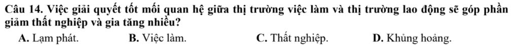 Câu 14. Việc giải quyết tốt mối quan hệ giữa thị trường việc làm và thị trường lao động sẽ góp phần giảm thất nghiệp và gia tăng nhiều?