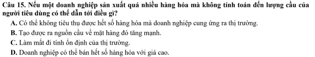 Câu 15. Nếu một doanh nghiệp sản xuất quá nhiều hàng hóa mà không tính toán đến lượng cầu của người tiêu dùng có thể dẫn tới điều gì?