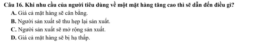 Câu 16. Khi nhu cầu của người tiêu dùng về một mặt hàng tăng cao thì sẽ dẫn đến điều gì?